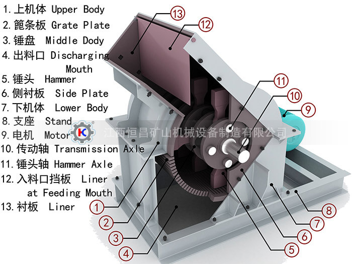 錘式破碎機由轉(zhuǎn)子、錘頭、傳動軸承、篩板、電機等部件組成。